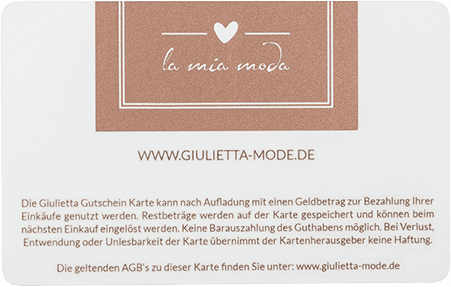 Die Giulietta Gutschein Karte kann in allen Giulietta Geschäfte der Oliver Göbel GmbH & Co.KG gegen Ware eingelöst werden. Das Guthaben wird nicht verzinst und wird nicht Bar ausgezahlt. Die Karte ist ab dem Datum der letzten Benutzung 5 Jahre lang gültig. Nach Ablauf dieser Frist verliert sie ihre Gültigkeit ohne weitere Benachrichtigung, eventuelles Restguthaben geht verloren. Jeglicher gewerblicher und kommerzieller Weiterverkauft der Karte ohne vorherige Zustimmung von der Oliver Göbel GmbH & Co.KG ist unzulässig. Die Oliver Göbel GmbH & Co.KG übernimmt keine Haftung für den Verlust, den Diebstahl, die Beschädigung, die Unlesbarkeit oder die unbefugte Nutzung dieser Gutscheinkarte. Die Oliver Göbel GmbH & Co.KG behält sich das Recht vor, diese Geschäftsbedingungen ohne Ankündigung zu ändern.